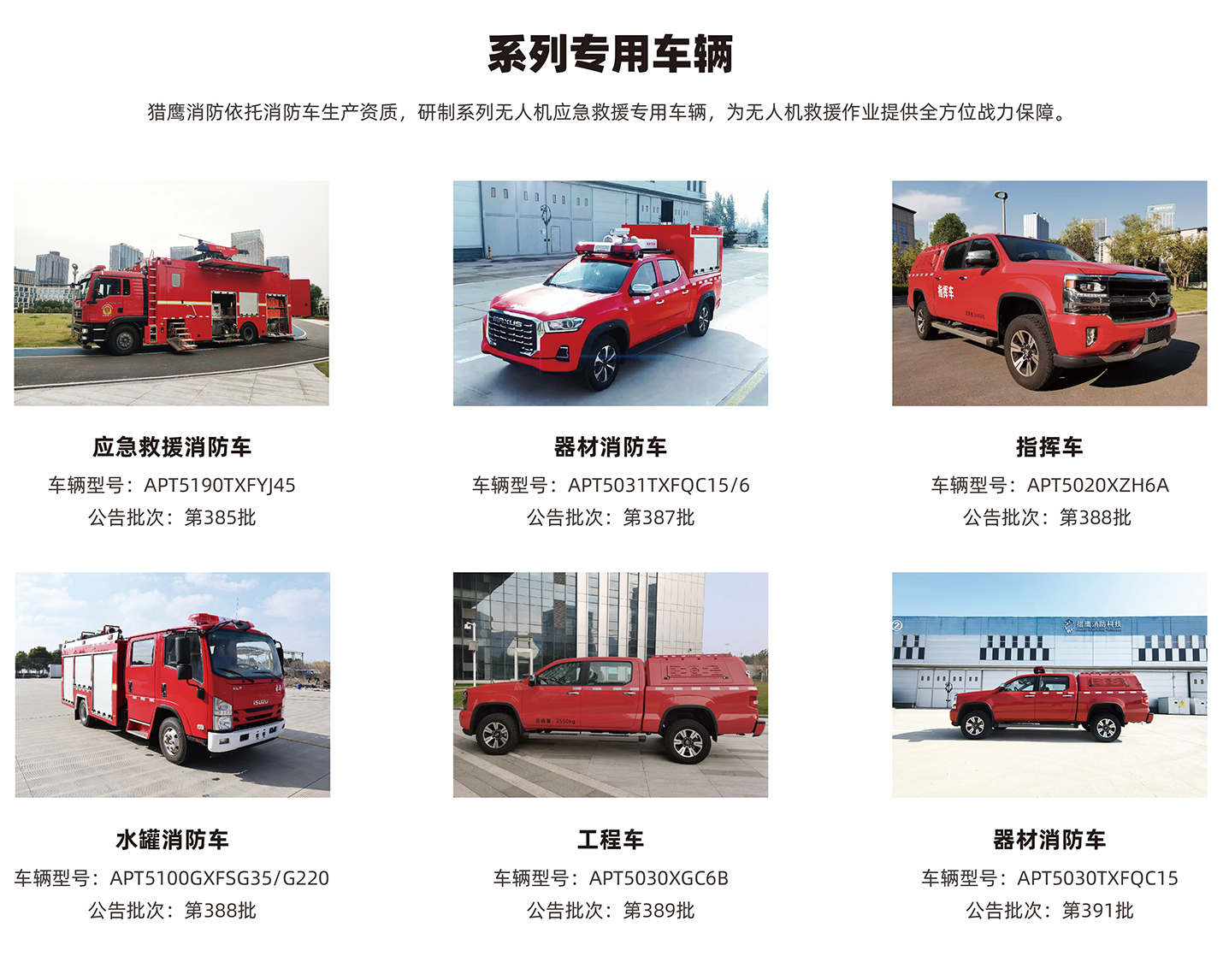 基于油動、電動、油電混合動力模式和大、中、小載重量的“鵬”、“鷹”、”雕”、“隼”、“鷂”五款消防無人機