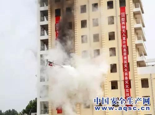 試驗(yàn)分為三項(xiàng),即由無人直升機(jī)分別攜帶儲(chǔ)壓超細(xì)干粉滅火裝置、高壓液體滅火裝置撲滅高層建筑室內(nèi)火災(zāi),攜帶高能滅火劑撲滅高層建筑外墻火災(zāi)。