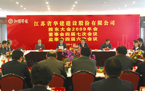 4月27日,公司股東大會2009年度年會、董事會四屆七次會議、監事會四屆六次會議在揚州召開,15個股東出席會議,公司董事會、監事會成員參加會議,公司部分高級管理人員列席會議。會議聽取和審議了公司副董事長、總經理宗有農所作的董事會和經營層工作報告;副總經理程杰所作的關于特級資質就位情況工作專題報告;監事會主席邢建安所作的監事會工作報告;公司副總會計師李長棟所作的關于2008年度財務報告及2009年度財務預算方案(草案)的報告,關于2008年度利潤分配方案(草案)的報告以及股東大會議事規則、董事會工作規則、監事會工作規則等三個草案;副董事長、副總經理陳榮春所作的關于董事會、監事會成員調整的提案說明。會議經投票,表決通過了上述報告、方案,增選李幼杰同志為公司第四屆董事會董事,潘巧宏為公司第四屆監事會監事。